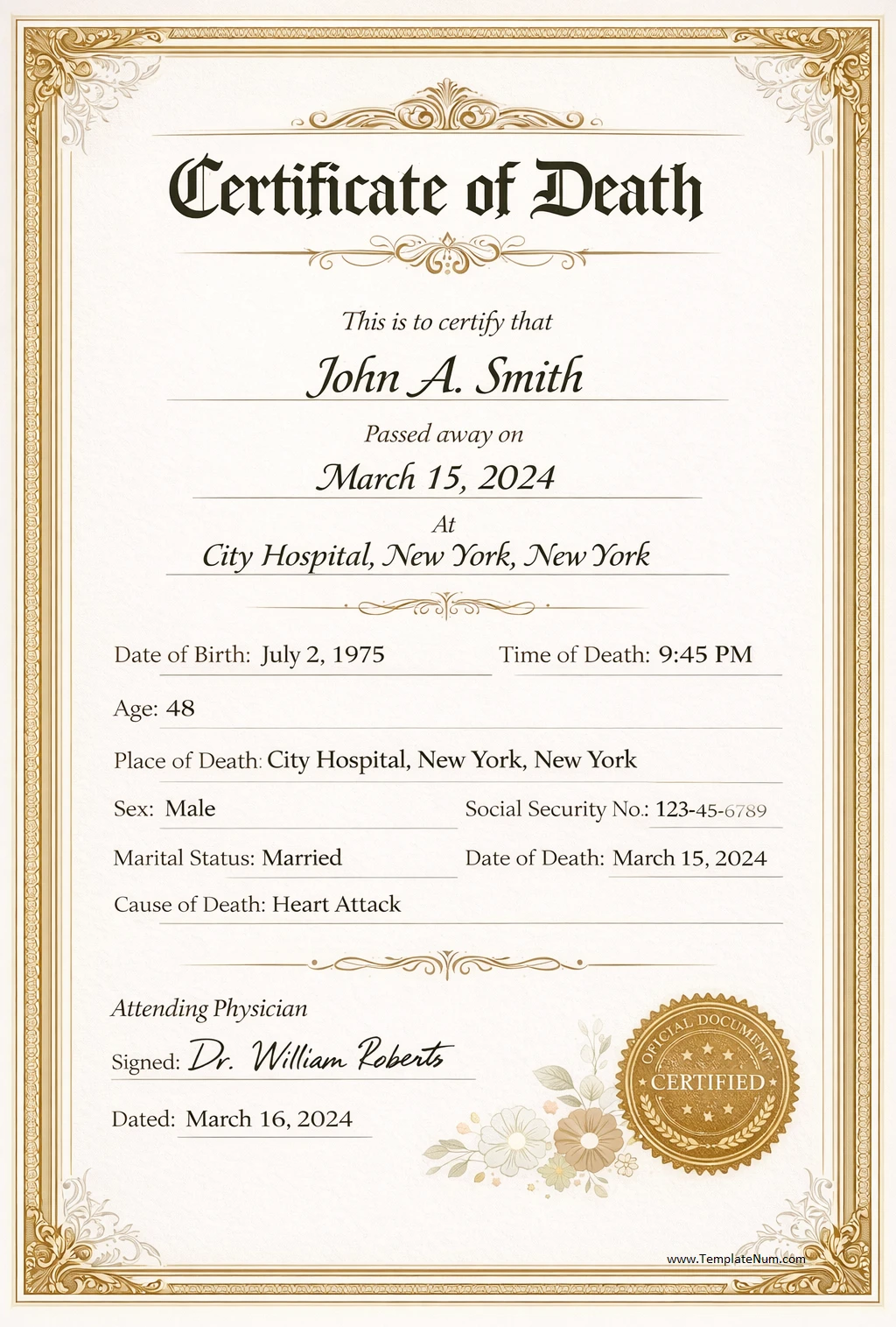 A death certificate is a legal document issued by the government that serves as an official record of an individual’s death. It includes vital information such as the deceased person’s full name, date and place of birth, date and place of death, cause of death, and the identity of the certifying physician.