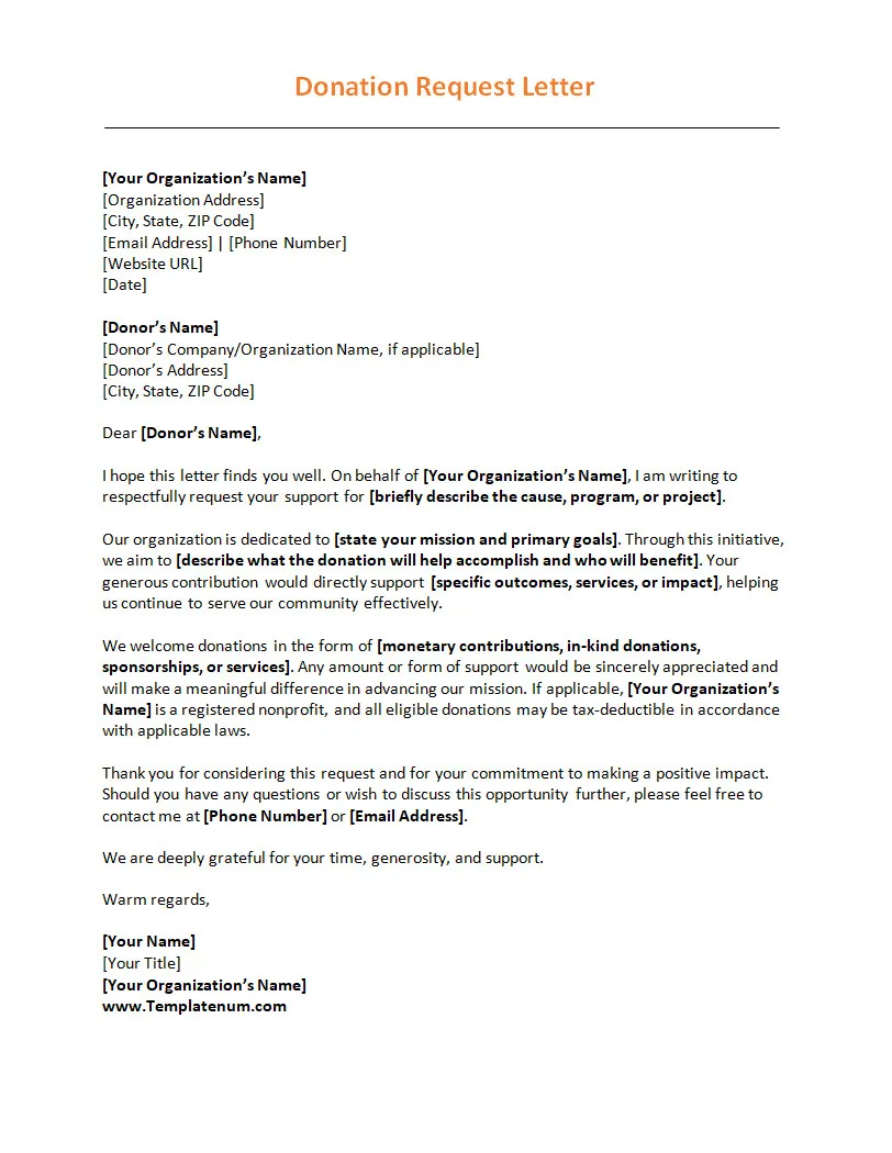 Clearly state what you are requesting from the donor in your letter, whether it’s a monetary contribution, an in-kind donation, volunteer assistance, or participation in an event. Make your request specific and actionable, outlining how the donor’s support will directly benefit your cause or project. Provide details on how donations will be used and the impact they will have, creating a sense of transparency and accountability.