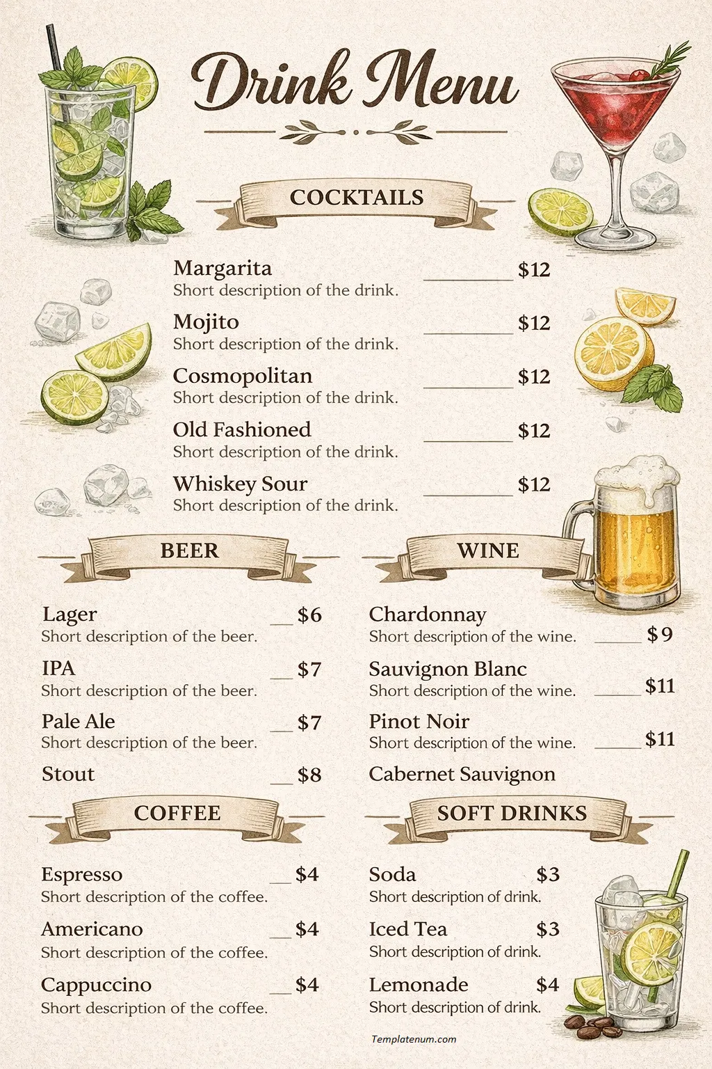 Download our Drink Menu Template today to create an attractive, professional menu that elevates your event or business.